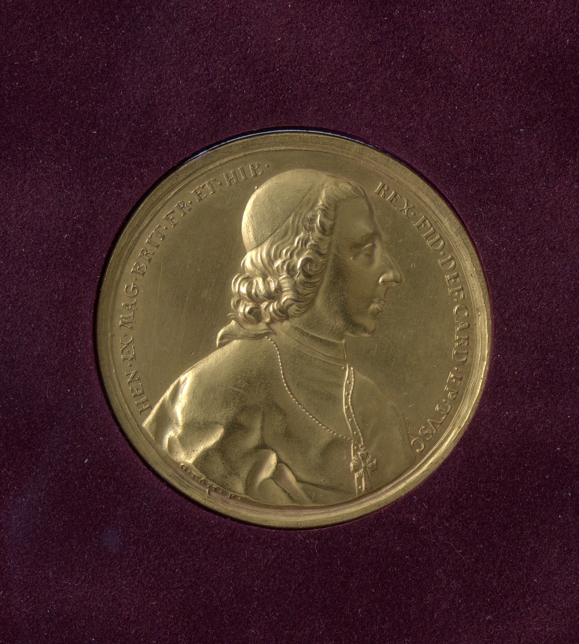 After the death of Charles Edward, the titular King Charles III, Cardinal Henry became the Jacobite heir to the throne as Henry IX (of England) and I (of Scotland). To commemorate this fact, a medal was minted in Rome in 1788. Its author was Gioacchino Hamerani (1761–1797), a member of the last generation of a famous family of medallists who worked for the Papal mint for two centuries, and for the Stuarts in Rome from the 1720s onward. The obverse shows a bust of Cardinal Henry Benedict, and the reverse the personification of Religion holding a cross and a book, with a lion at her feet. The inscription reads NON DESIDERIIS . HOMINVM . SED . VOLVNTATE . DEI In exergue: AN. / MDCCLXXXVIII, which can be translated as: ‘Not by the wish of man but by the will of God: Anno Domini 1788.’ This formula refers to the idea of legitimacy, emphasising that the status of Henry as titular King of England, Scotland and Ireland, was not based on popular recognition, but by divine right.