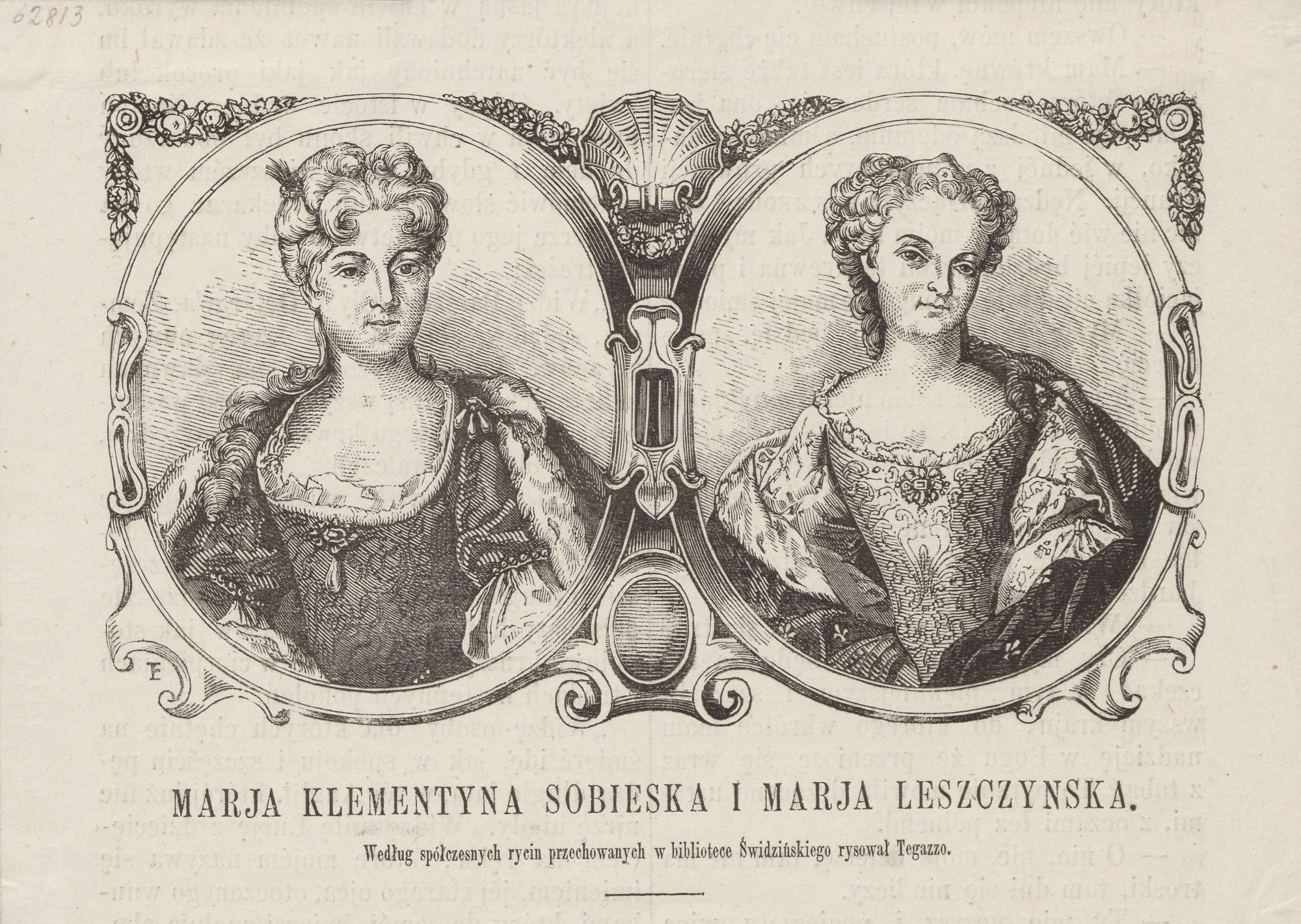 This cross-grain woodcut by Warsaw-based painter and illustrator Franciszek Tegazzo (1829–1879) was used to illustrate an article entitled “Marja Klementyna Sobieska i Marja Leszczyńska” by Józefa Śmigielska-Dobieszewska (1820–1899), a novelist and journalist from Warsaw. It appeared in Kółko Domowe (Home Circle), a magazine intended for families, which also concerned itself with the role of women in the Polish tradition, published and financed largely by the author. In her article, Śmigielska compared the fates of two Polish aristocrats, Clementina Sobieska and Maria Leszczyńska. According to her, both were unhappy in their marriages, but showed particular concern for the poor and disadvantaged. Tegazzo made portraits of the subjects of the article using 18th-century engravings as models.